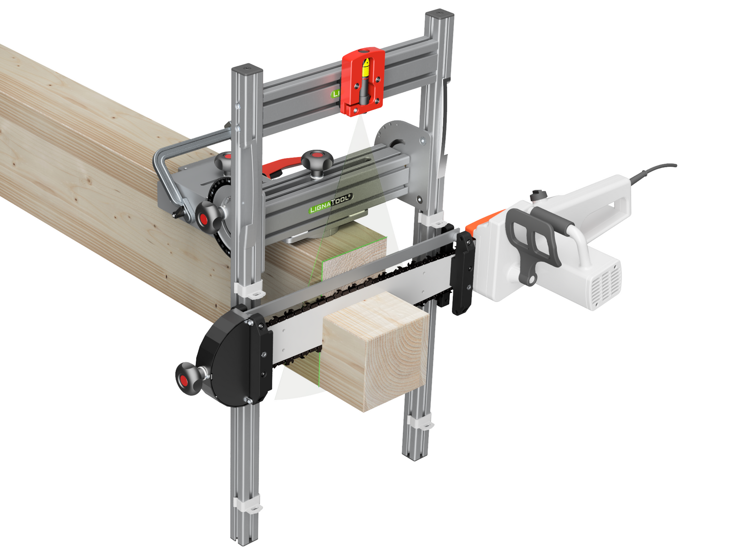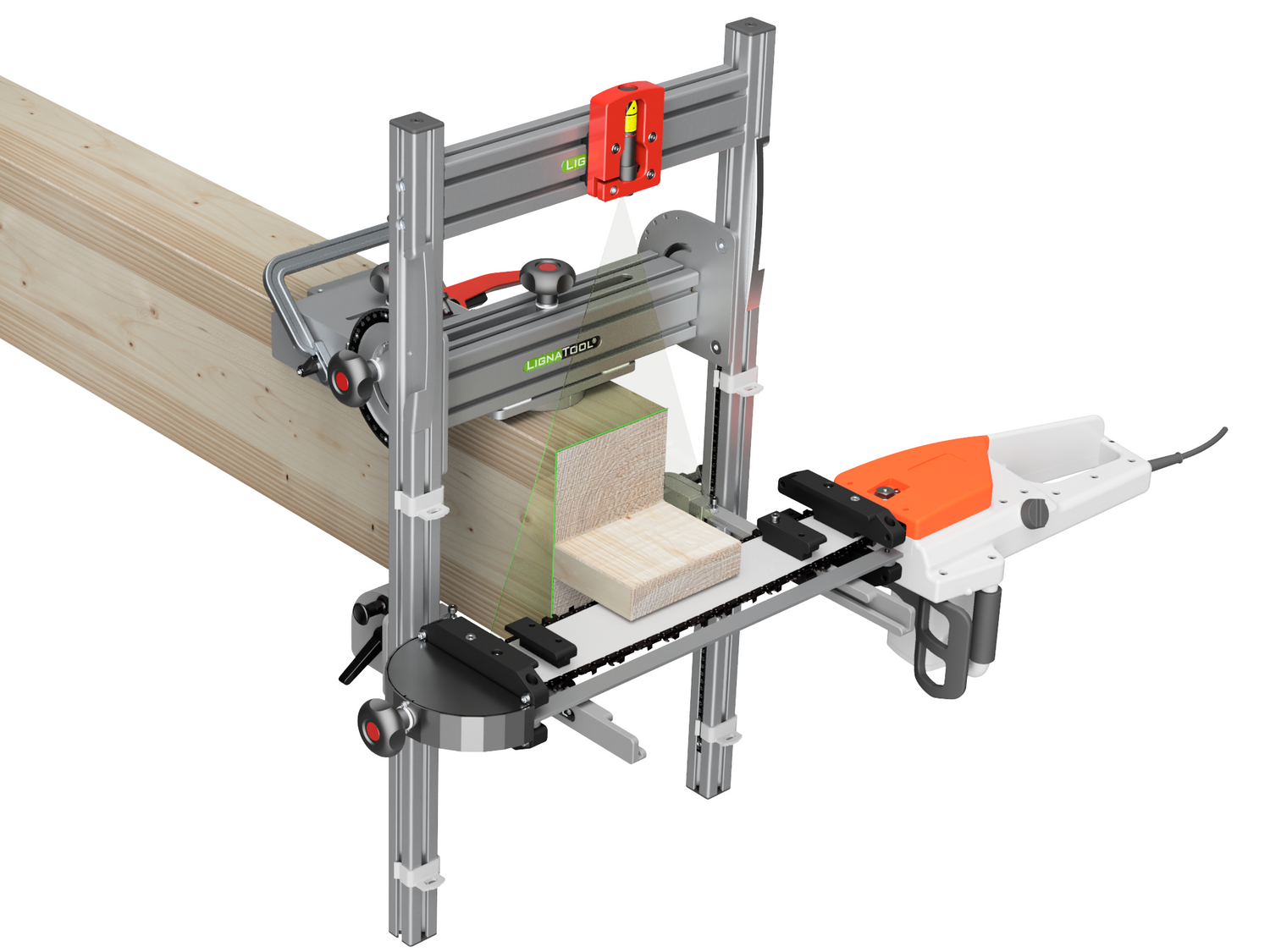 La hoja de la sierra de cadena se engancha en la guía de corte mediante un simple giro, por lo que se puede cortar de forma fácil, segura y muy precisa, a lo largo del perfil de la guía.La línea láser muestra la posición exacta del corte lateralmente y también por encima de la viga.