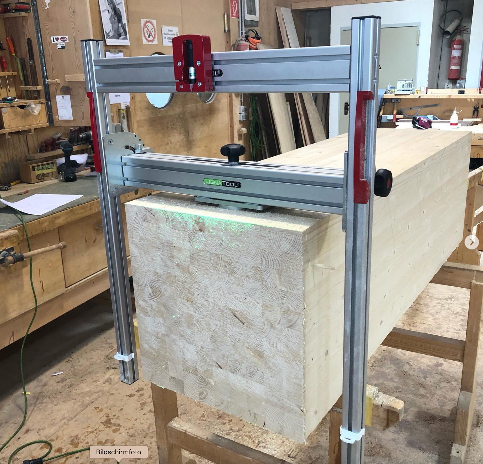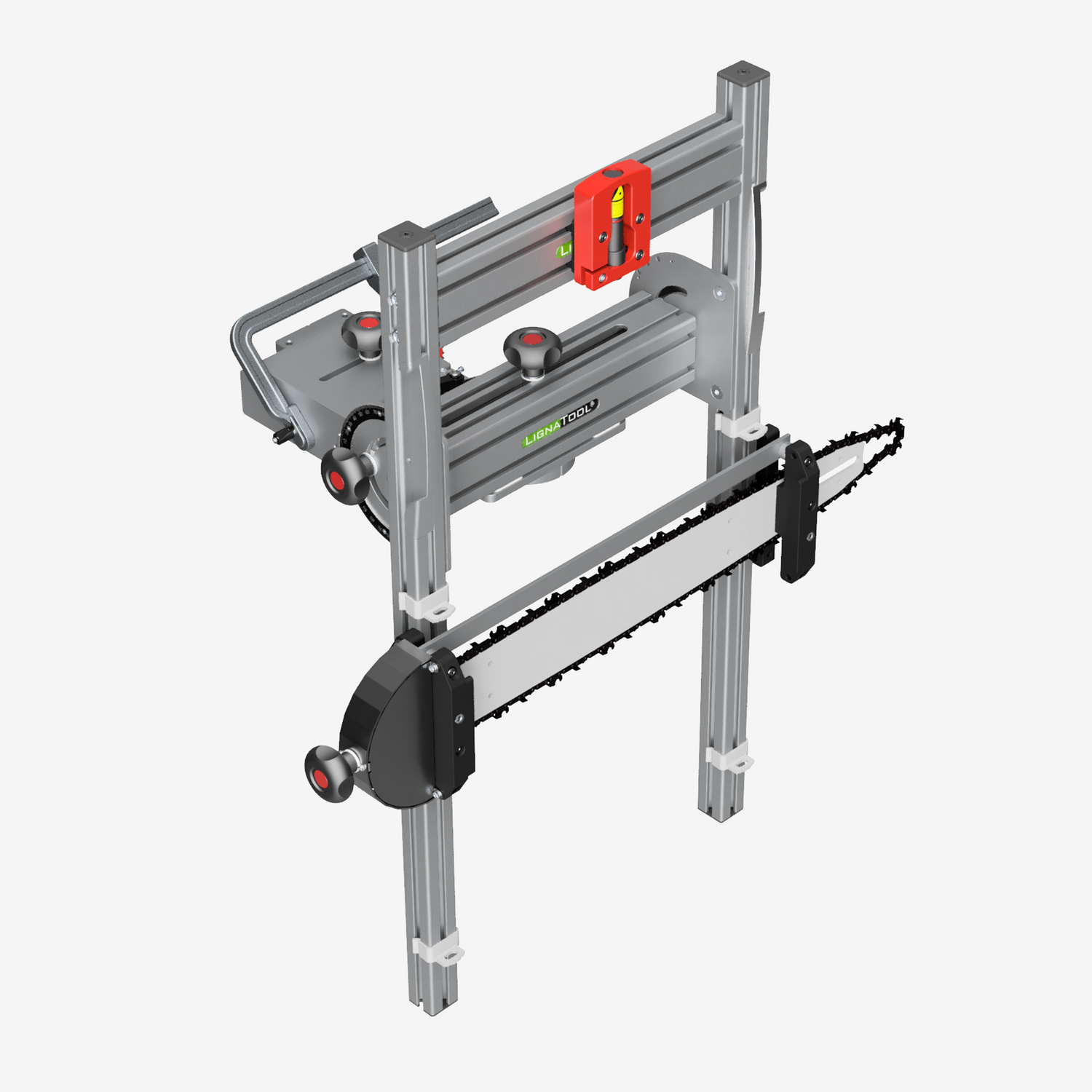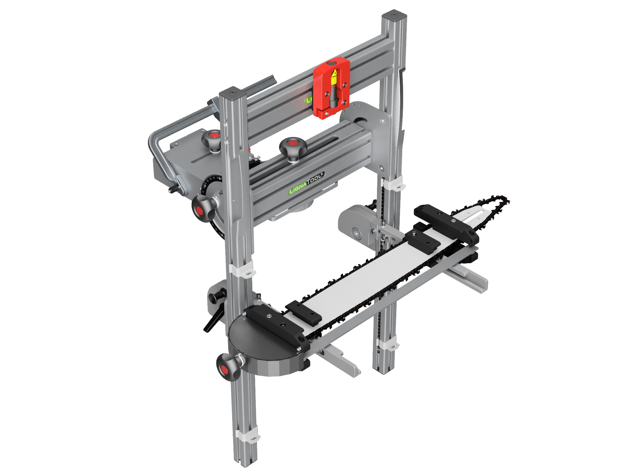 El adaptador para troncos permite procesar troncos de forma segura y eficaz en combinación con la motosierra. Se fija mediante atornillado o, en el caso de troncos visibles, mediante trincaje.
