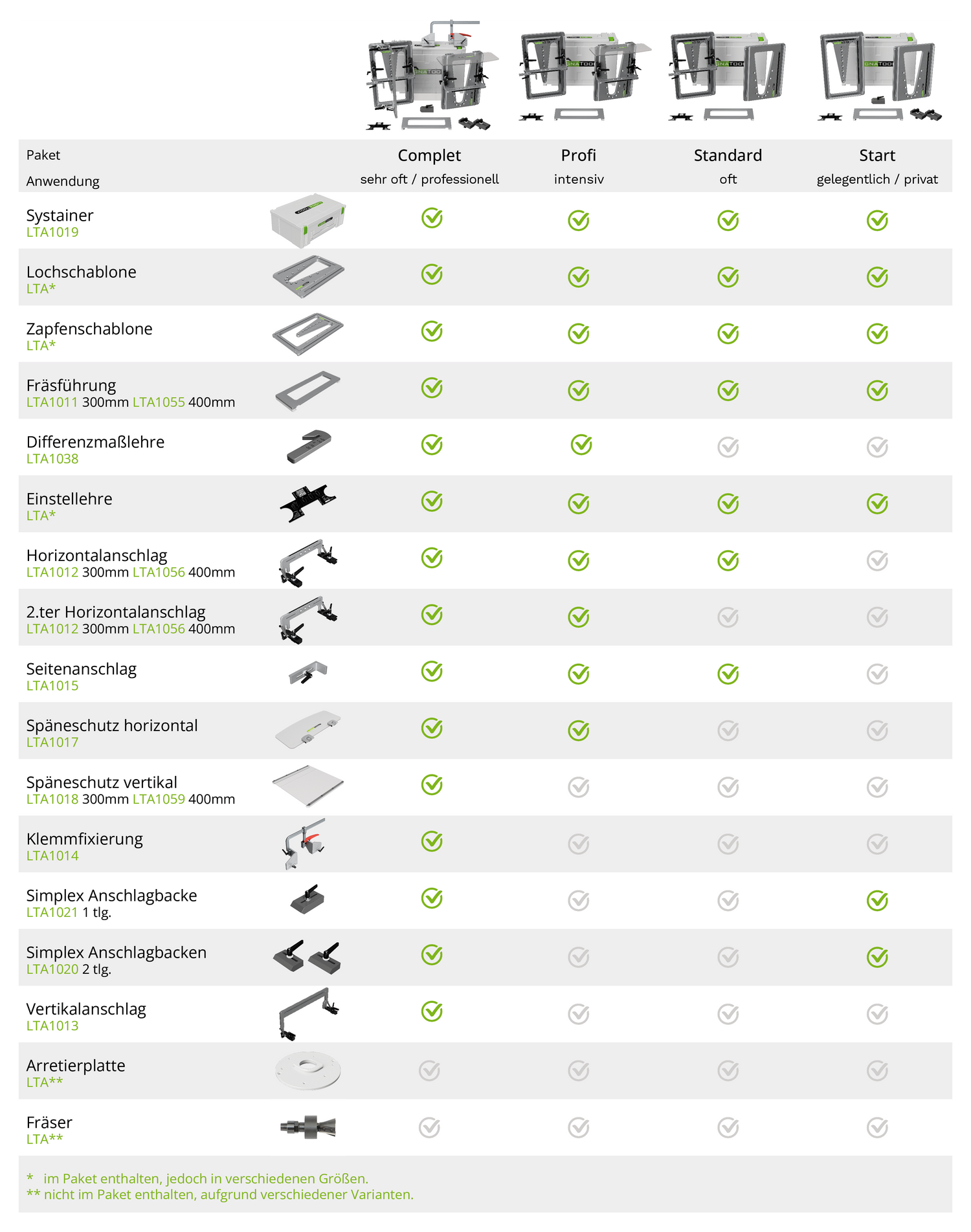 Je nach Oberfräse gibt es verschiedene Arretierplatten und Fräser, Konfiguration und Preise können daher abweichen.